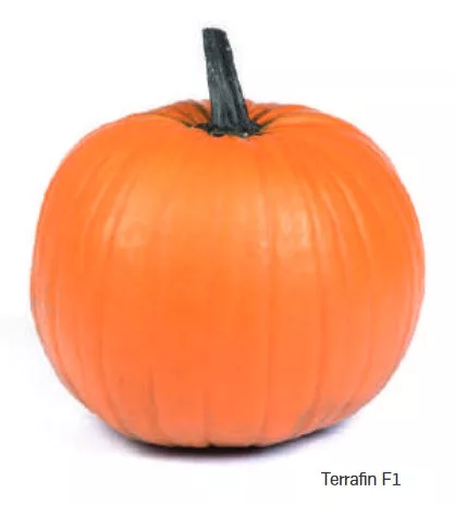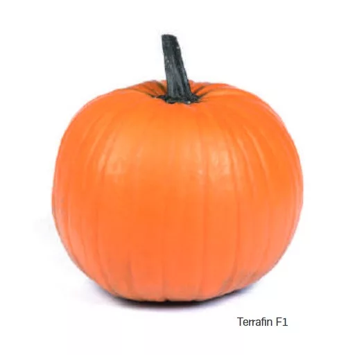 A Terrafin F1 egy halloweenes sütőtöknek is megfelelő, termése kerek alakú, intenzív narancssárga színű, enyhén bordázott, egységes.